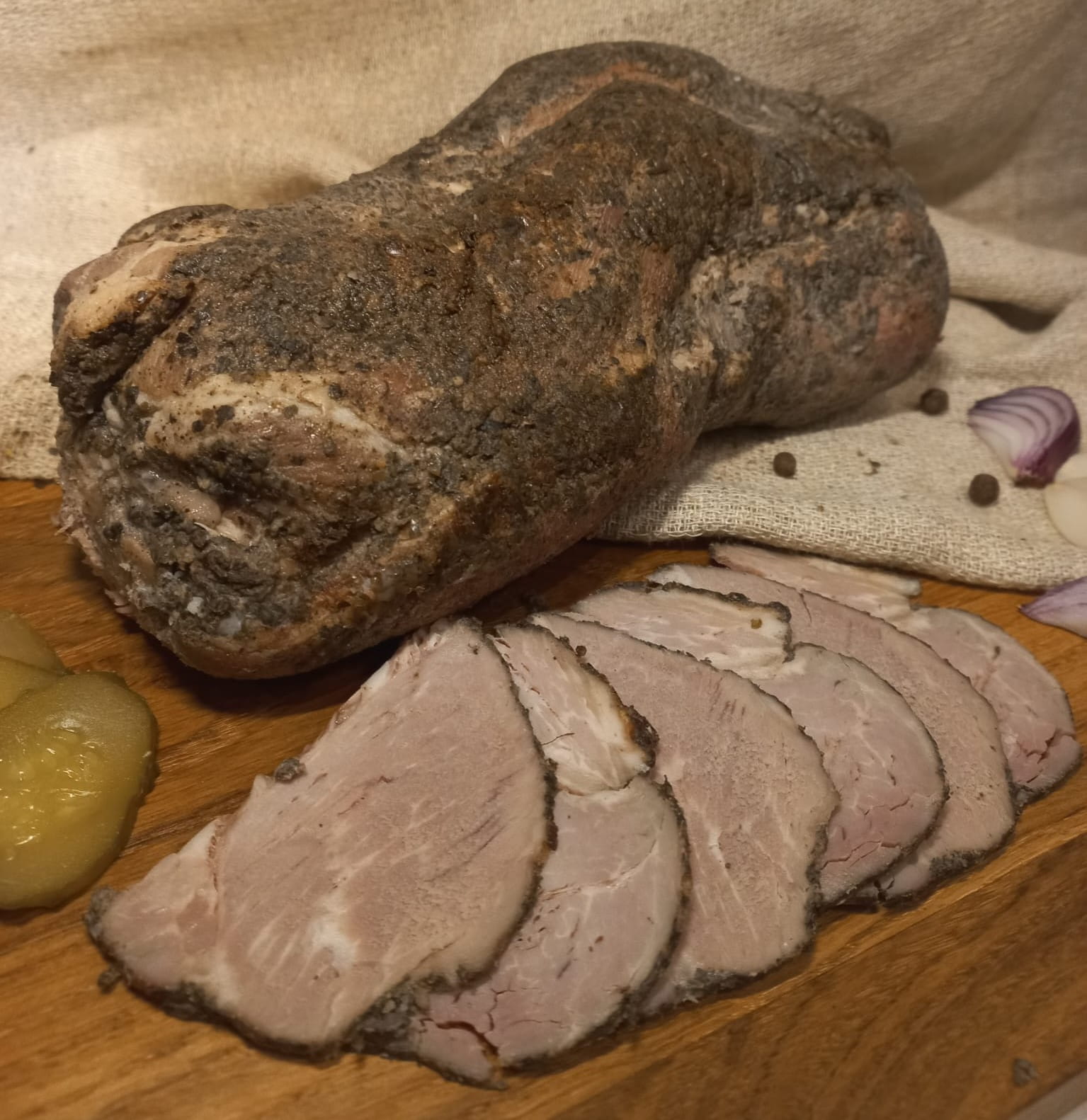 Pieczeń z karkówki marynowanej przez okres 7 dni w kąpieli soli jodowanej połączonej z wywarem ziół i przypraw wg własnej receptury, posypana naturalnymi przyprawami zwinięta i pieczona pod przykryciem w piecu.